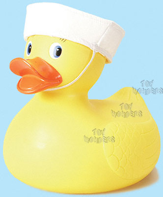 1083S 10" Rubber Duck with Sailor Cap. Cute rubber duckie measures 10" long, 10" high, and 8.5" wide. White sailor hat attaches to head with elastic band. Duck also floats!