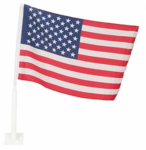 12188F US Car Flags, 12"x18" U.S. auto flag. Includes 19" pole that clips securely onto any car window. The flag can be removed from the base to be used as a parade flag. UPC coded and individually packed in clear plastic bag.