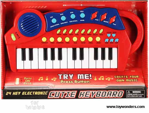 365W 24-Key Electronic Keyboard. This 24 keys piano features 19 demo songs, 8 rhythms, 8 instruments, 4 percussion instruments & animal sounds, volume and tempo control, record and play button. Includes 3 "AA" batteries. Box size: 14.25”L x 9.5”W x 2.5”H.