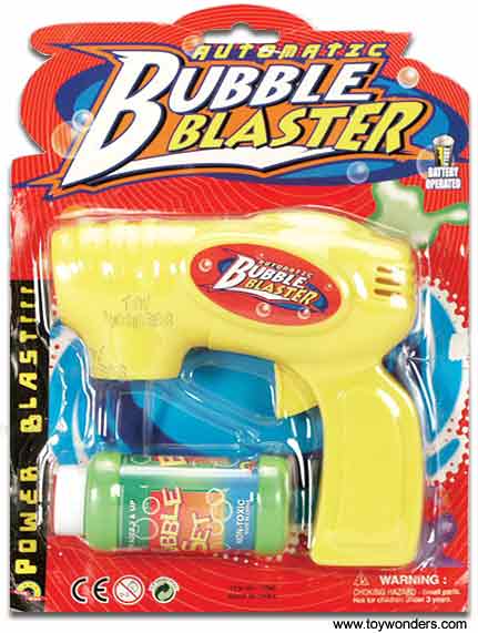 776C Auto Bubble Gun. Battery operated toy gun 7.75" in length that shoots a stream of bubbles. Includes a 4oz bottle of soap solution. Uses 2 "AA". Batteries not included. Card size: 8.25" x 11". Inner: 24 pcs.