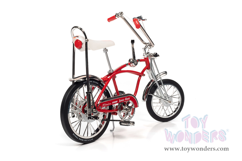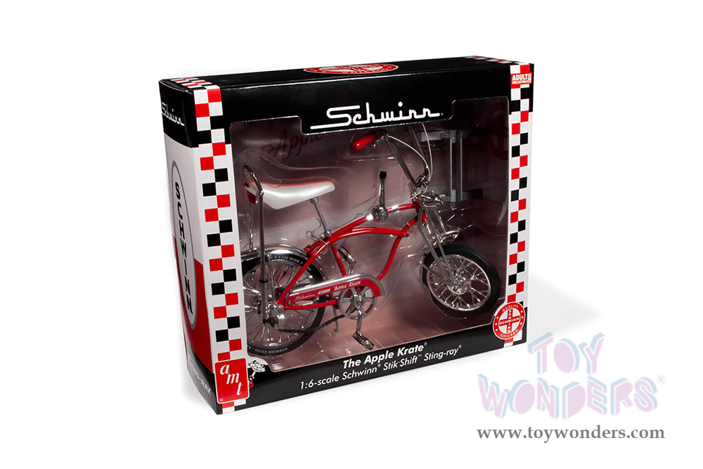 AMTD002/12 AMT - 1969 Schwinn® Stik-Shift™ Sting-Ray® "The Apple Krate®" Bicycle. 1:6 scale diecast collectible model. This Bike is 9.25"L x 4"W x 7.25"H. Die-cast wheel stand included for display. This Krate® Bike is manufactured by AMT. Individually packed in a window box. Box size: 10.5"L x 3,25"W x 9"H. AMTD002/12 is in Apple Red.