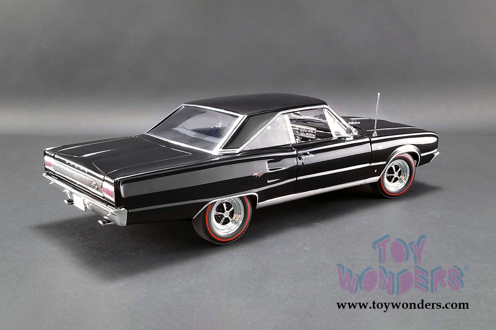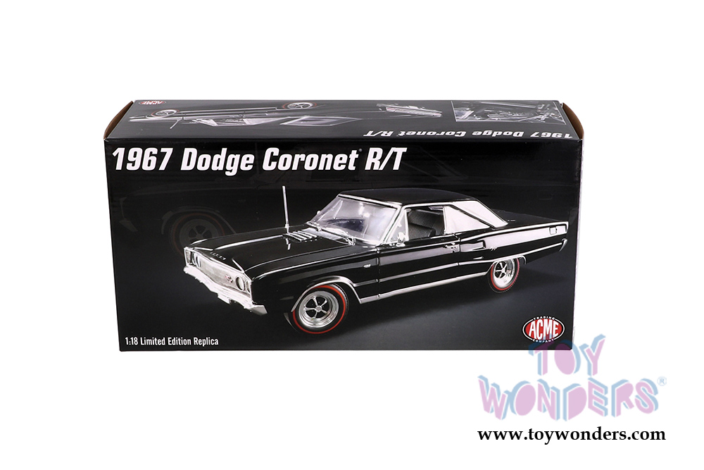 A1806603 ACME - 1967 Dodge Coronet® R/T Hardtop. 1:18 scale diecast collectible model car. This is an 11.25"L x 4"W x 3"H car with free wheels and workable steering. This Dodge features cloth seat belts and poseable steering. Plumbed and wired engine with serialized plate. This Coronet® R/T is manufactured by ACME. Box size is 13.5"L x 6.5"W x 4.5"H. Item A1806603 is in BLACK. Limited Edition to 492 pcs.