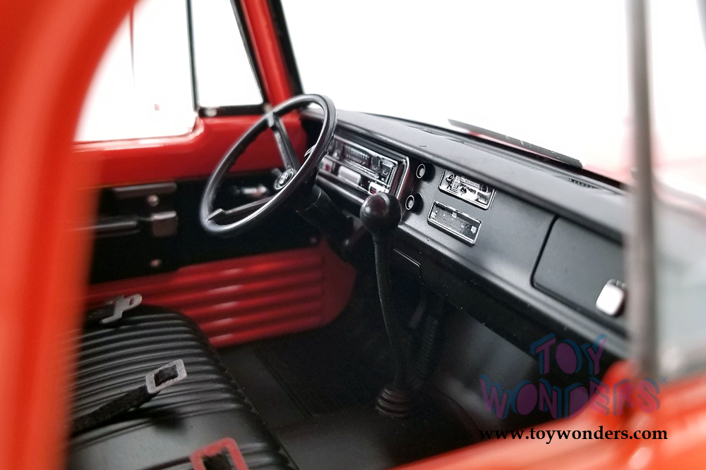A1801900 Acme - 1970 Dodge D-300 Ramp Truck. 1:18 scale diecast collectible model. This Ramp truck is a 16.5"L x 5.25"W x 4"H diecast car with adjustable wheel chocks on ramp bed. This '70 Ramp Truck is manufactured by Acme. Item A1801900 comes in Burnt Orange. Individually packed in a box. Box size: 19"L x 7.25"W x 6.5"H. Limited edition.
