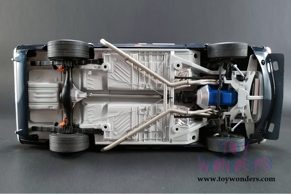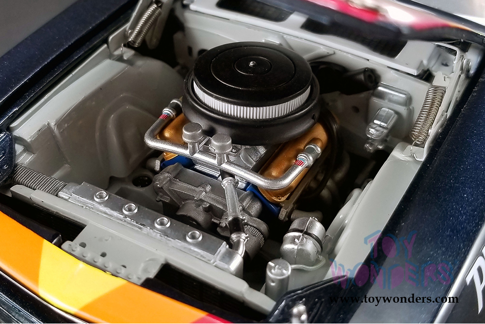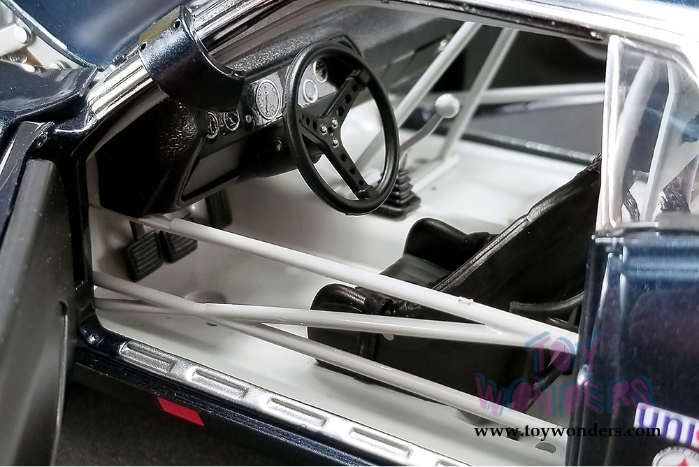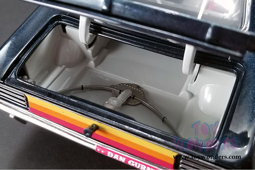This Plymouth is 10.5"L x 4.5"W x 3.75"H diecast metal car with openable doors, hood, and trunk. It features cloth seat belts, poseable steering, plumbed and wired engine, and serialized plate. This '70 Barracuda is manufactured by Acme. Item 1806103 comes in Dark BLUE color. Individually packed in decorated a box. Box size: 14"L x 7"W x 5.25"H. Limited Edition to 696 pcs Worldwide.