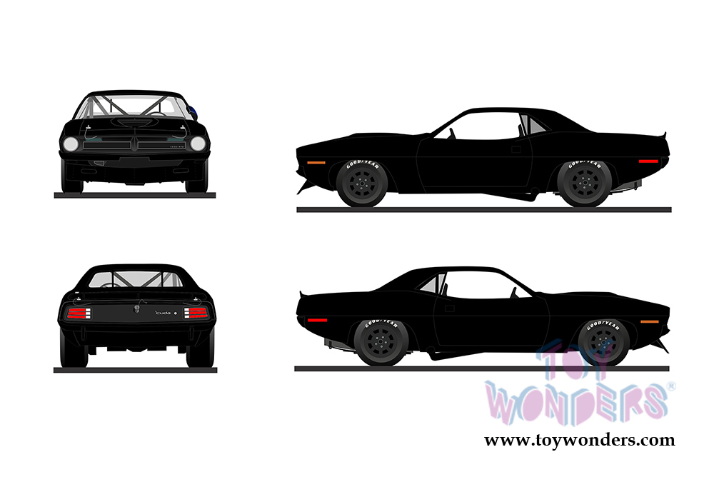 This Plymouth is 10.5"L x 4.5"W x 3.75"H die-cast metal car with openable doors, hood and trunk. It features cloth seat belts, poseable steering, plumbed and wired engine, and serialized plate. This '70 Barracuda is manufactured by Acme. Item 1806108 comes in Matte BLACK. Individually packed in decorated a box. Box size: 14"L x 7"W x 5.25"H. Limited Edition to 522 pcs. Worldwide.