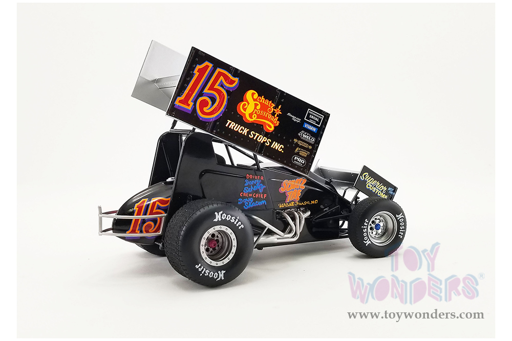A1809523 Acme - Winged Sprint Car #15 Donny Schatz "Schatz Crossroads Truck Stops Inc." First 410 Sprint Win 1994. 1:18 scale die-cast collectible model. This Sprint car is an 8"L x 4"W x 4.5"H die-cast metal car with a removable hood. Manufactured by Acme. Individually packed in a decorated box. Box size: 13"L x 6.25"W x 5.25"H. Item A1809523 is in Black.