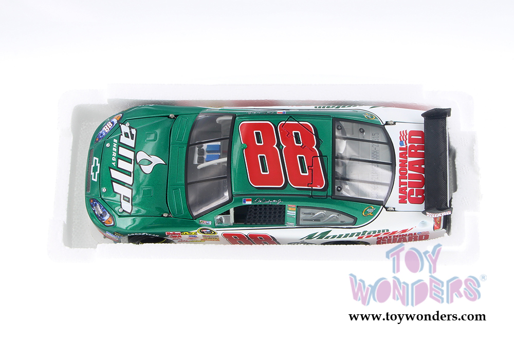 This NASCAR Racing Car is an 8.5"L x 3.25"W x 2.5"H diecast metal car with window nets. Each car is individually packed in die-cut foam insert which protects model within the box. Box size is 10"L x 4.5"W x 3.5"H. Cardboard outer box provides additional protection. Outer box measures is 12.5"L x 7"W x 6"H. Sponsored by AMP, Mountain Dew, 3M, Sprint, MAC Tools, EA Sports and many more. Action Racing Collectibles. Still The Choice of Champions. Platinum Series. Limited Edition 1 of 24,027.