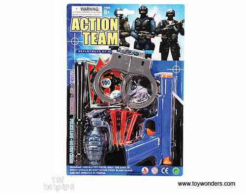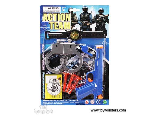 9009/12 Action Team. This play set includes a 6.5" long pistol (gun), soft bullets, handcuffs, and more. Card size: 8.5" x 12.5". 24 pcs/inner. 9009/12 is in assorted styles.