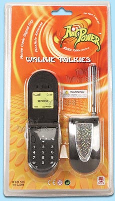 2220B Air Power Walkie Talkies. Walkie talkies w/ morse code signal key & flexible antenna. Each handset requires one "9V" battery. Card size: 6.5"x12".