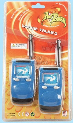 2260B Air Power Walkie Talkies. Walkie talkies w/ morse code signal key & flexible antenna. Each handset requires one "9V" battery. card size: 6.5"x11.5".