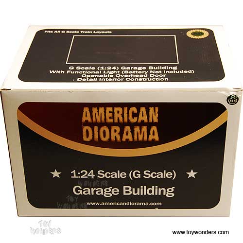 15808 American Diorama Buildings - 1:24 scale Garage Building. The Garage Building measures in size:10.5"L x 8.0"W x 8.0"H; driveway is 5.5"L x 8.0"W; and inside the garage you have 9.0"L x 7.0"W x 7.0"H of storage space. This type of garage has been around for more than 80 years. You can show off your die cast car collection with several of our accessories and you will have a unique display of your own. This garage come built and painted, with detailed interior and exterior. package include 3 pieces, a roof, a driveway and the garage itself. Roof can be lift off from the building to allow further decoration of the interior. Light is pre-installed in front of the garage and the battery box is located at the back. Requires 2 "AA" batteries to operate the light. Batteries not included. This garage is perfect for decorating 1:22.5 to 1:24 scale cars, buildings and other dioramas accessories. Manufactured by American Diorama. Individually packed in a box. Note: Car and accessories are not included.