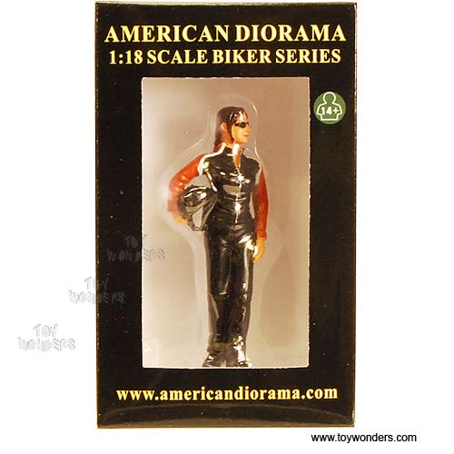 77703 American Diorama Figurine - Biker Series Jane in BLACK. Hand painted figures. This Jane figure is 3.5", and great for decorating 1:18 scale cars and motorcycles dioramas. Manufactured by American Diorama. Individually packed in a window box. Box size: 3.25"L x 2"W x 5.5"H.