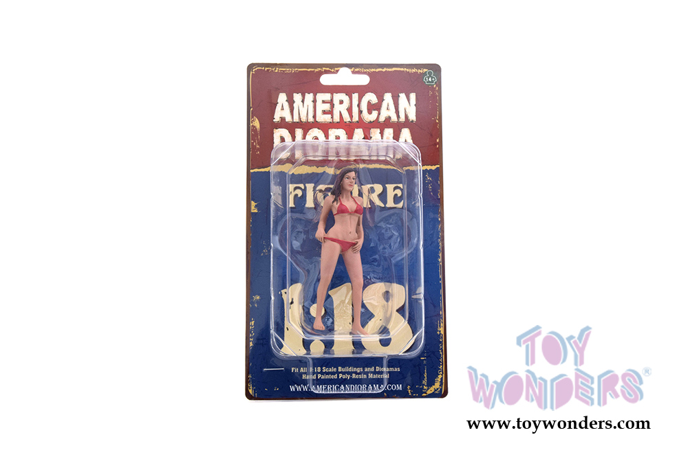 38174 American Diorama Figurine - Bikini Girl October. 1:18 scale female figure in a red bikini. Hand painted cold-cast resin. This 4"H figure is great for decorating 1:18 scale cars, auto body shop, and dioramas. Manufactured by American Diorama. Individually packed in a blister card. Card size: 5" x 8.5".