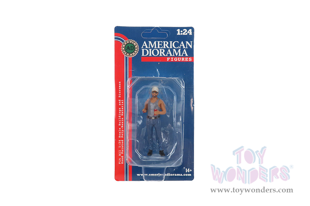 76438 American Diorama Figurine - Campers Figure 5. 1:24 scale male figure in a gray shirt and blue pants. Hand painted cold-cast resin. This 3"H figure is great for decorating 1:24 scale cars, auto body shop and dioramas. Manufactured by American Diorama. Individually packed in a blister card. Card size: 4" x 7.5".