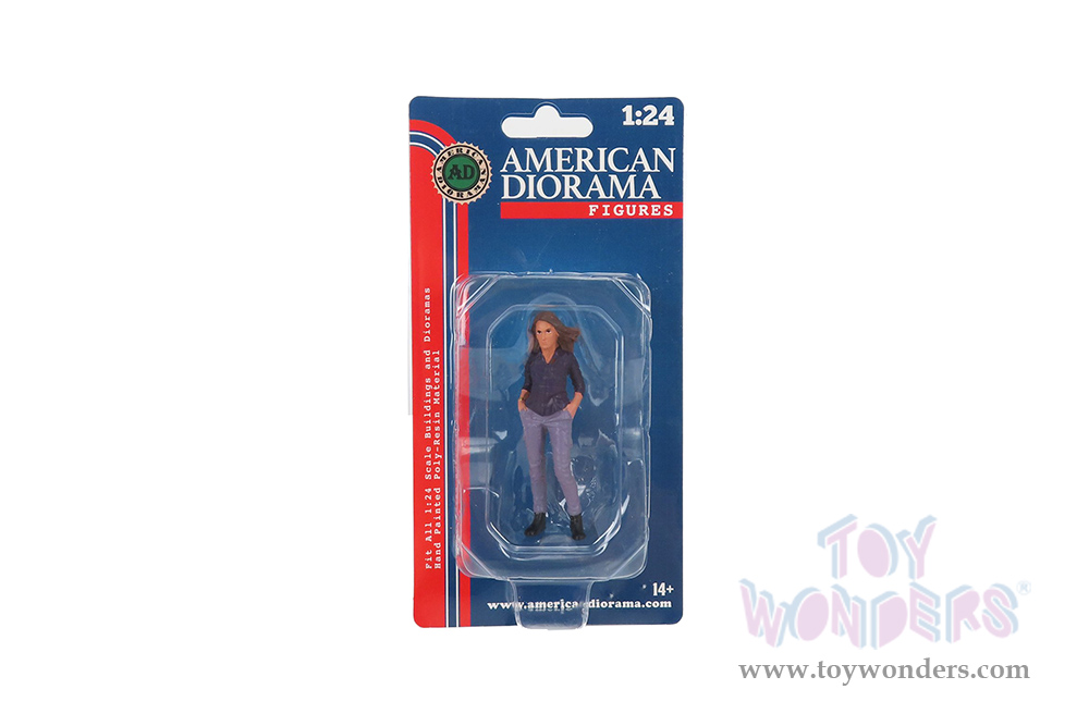 76430 American Diorama Figurine - Car Meet 3 Figure 5. 1:24 scale female figure in a dark blue shirt and purple pants. Hand painted cold-cast resin. This 3"H figure is great for decorating 1:24 scale cars, auto body shop and dioramas. Manufactured by American Diorama. Individually packed in a blister card. Card size: 4" x 7.5".