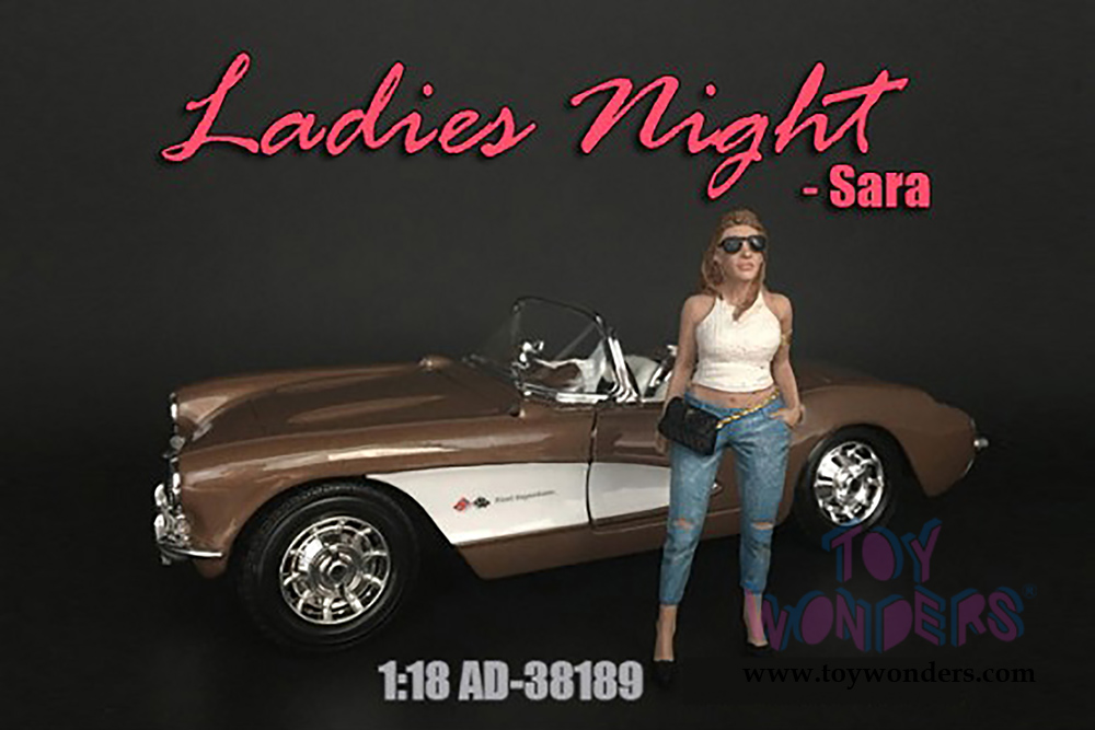 38189 American Diorama Figurine - Ladies Night Sara Figure. 1:18 scale female figure in light blue pants and white shirt. Hand painted poly-resin material. This 4" high figure is great for decorating 1:18 scale cars and dioramas. Manufactured by American Diorama. Individually packed in a blister card. Card size: 5" x 8.5". 12 pcs per inner box. Note: Vehicle is not included.