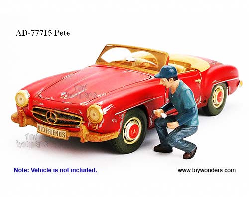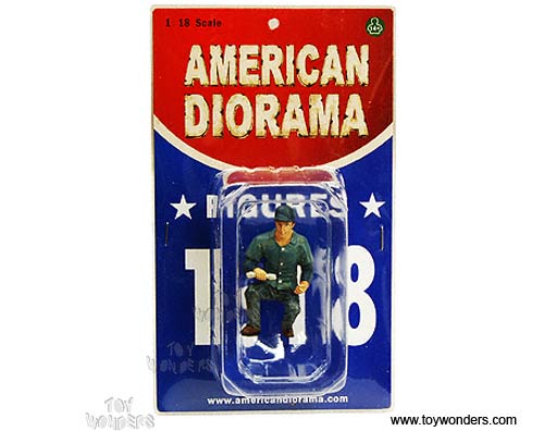 77715 American Diorama Figurine - 1:18 scale Mechanic Pete Figure in BLUE. Hand painted poly-resin material. This 2.75" long figure is great for decorating 1:18 scale cars and dioramas. Manufactured by American Diorama. Individually packed in a blister card. Card size: 5" x 8.5". 12 pcs per inner box.