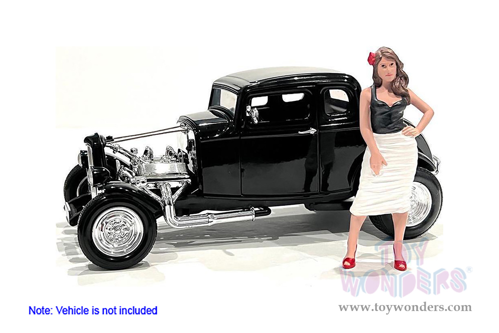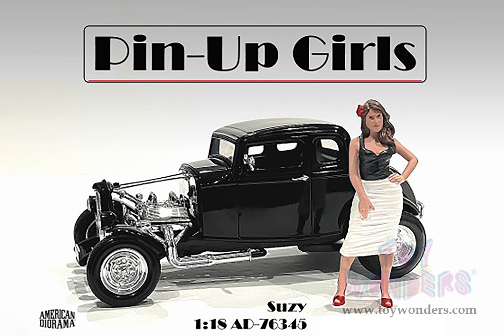 76345 American Diorama Figurine - Pin-Up Girls | Suzy. 1:18 scale female in black blouse and white dress. Hand painted poly-resin material. This 4"H figure is great for decorating 1:18 scale cars and dioramas. Manufactured by American Diorama. Packed in a blister card. Card size: 5" x 8.5". 12 sets per inner. Note: Vehicle is not included.