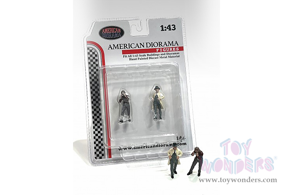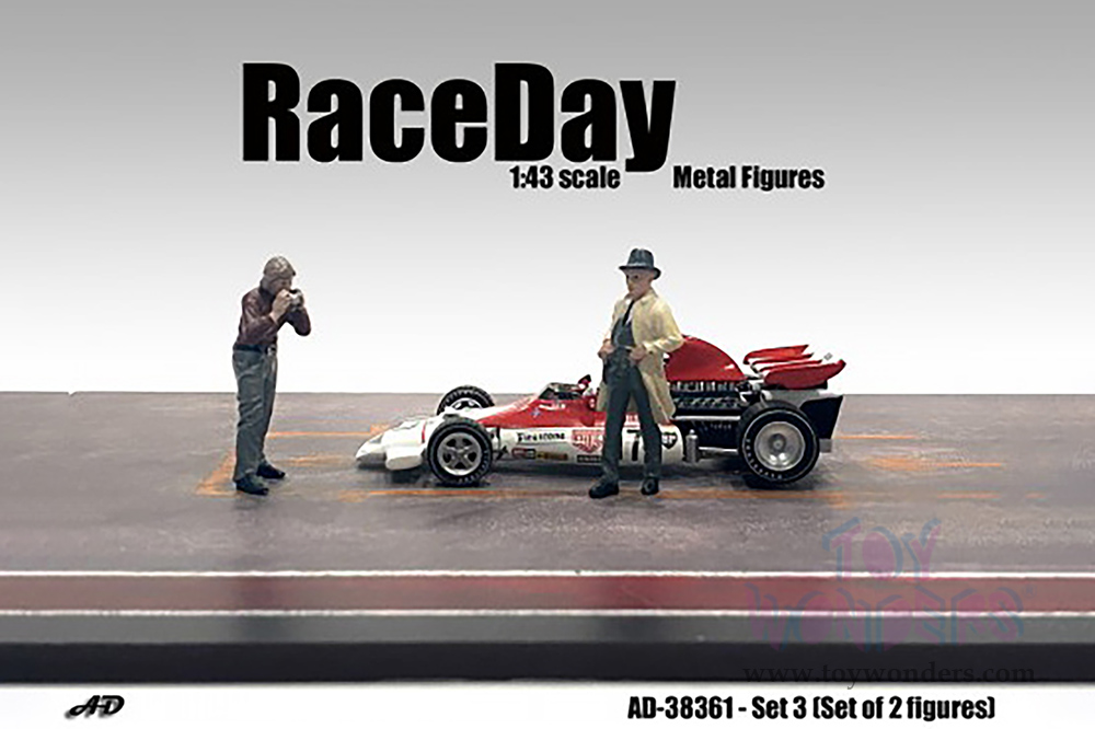 38361 American Diorama Figurine - Race Day Metal Figures Set 3. 1:43 scale male figures (2 figurines set). Hand painted die-cast. Each figure is 1.75" tall. Figure set is great for decorating 1:43 scale cars, auto body shop and dioramas. Manufactured by American Diorama. Individually packed in a blister card. Card size: 5.25" x 7". Note: Vehicle is not included.