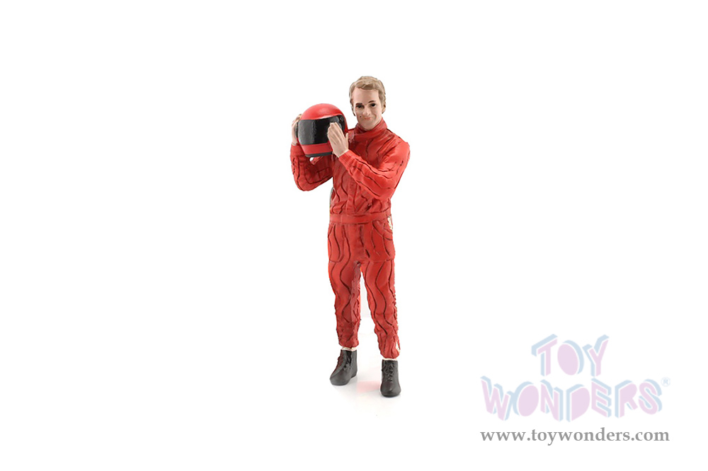 76352 American Diorama Figurine - Racing Legends | The 70s Driver B. 1:18 scale male figure in a red racing outfit. Hand painted cold-cast resin. This 4"H figure is great for decorating 1:18 scale cars, auto body shop and dioramas. Manufactured by American Diorama. Individually packed in a blister card. Card size: 5" x 8.5".