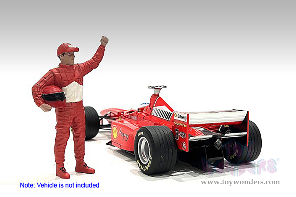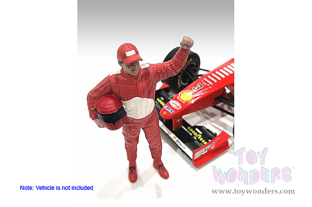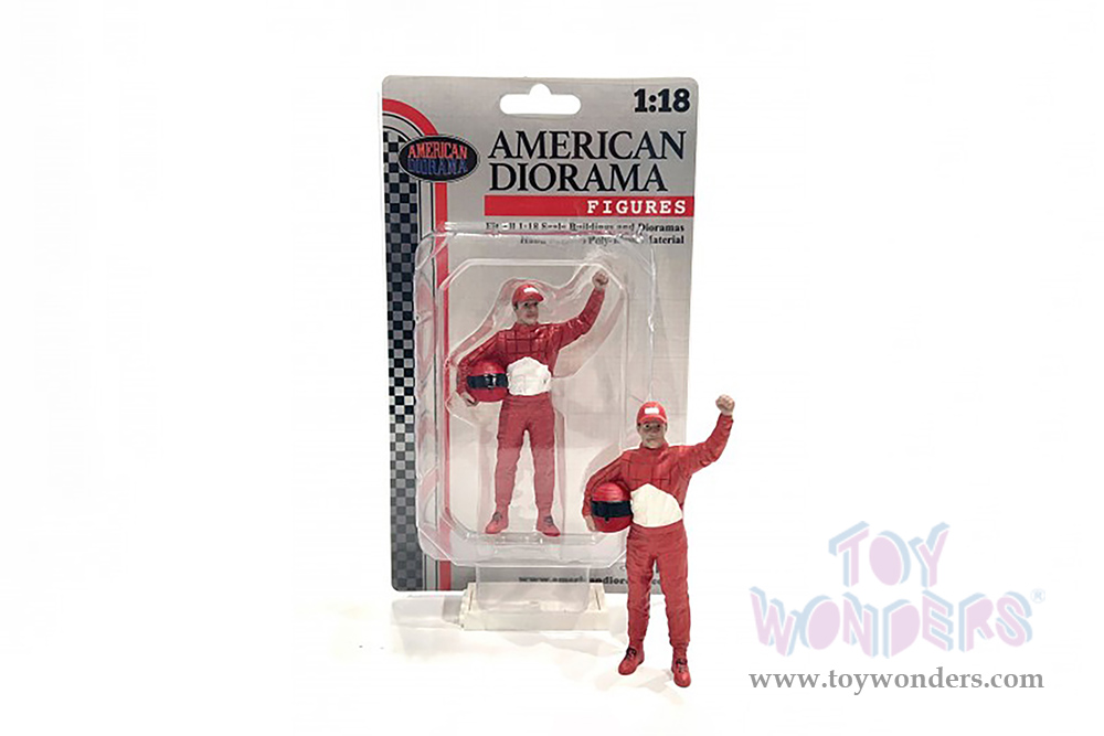 76356 American Diorama Figurine - Racing Legends | The 90s Driver B. 1:18 scale male figure in a red and white racing outfit. Hand painted cold-cast resin. This 4"H figure is great for decorating 1:18 scale cars, auto body shop and dioramas. Manufactured by American Diorama. Individually packed in a blister card. Card size: 5" x 8.5". Note: Vehicle is not included.