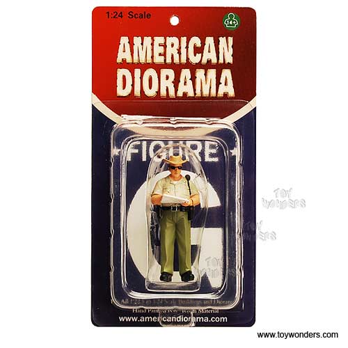 51598 American Diorama Figurine - 1:24 scale Sheriff Dave Figure in DARK BLUE. Hand painted cold-cast resin. This 2.75" police figure is great for decorating 1:24 scale cars and dioramas. Manufactured by American Diorama. Individually packed in a blister card. Card size: 3.75" x 7.5". 12 pcs per inner.