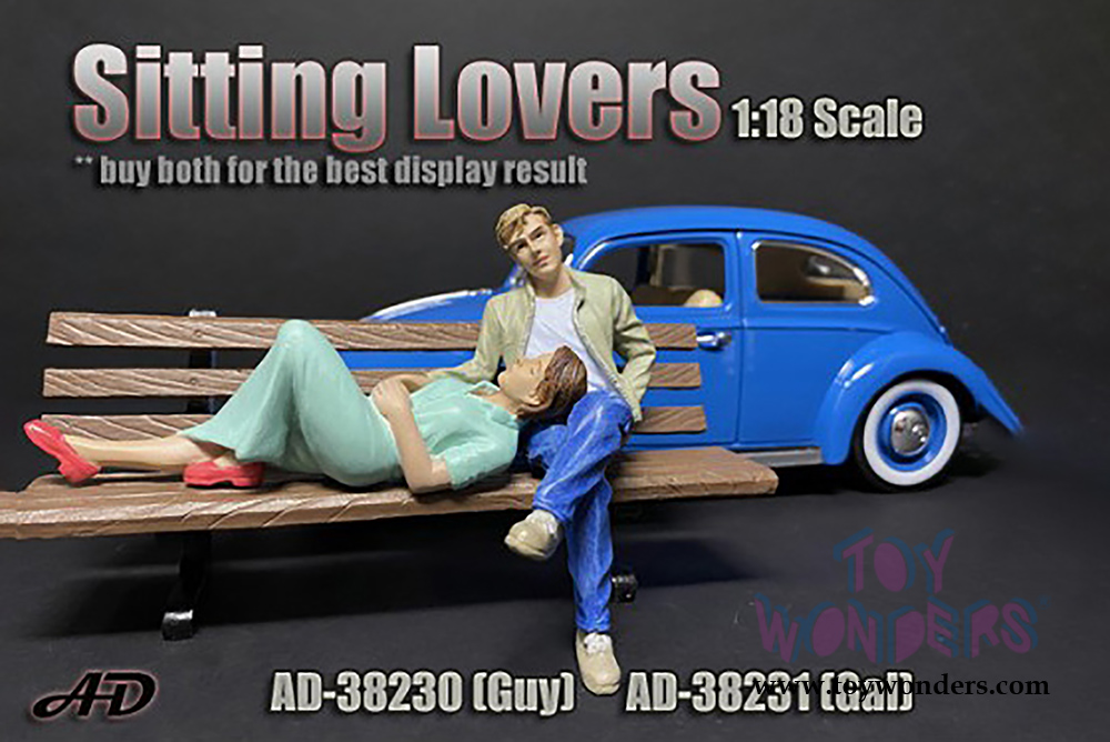 38330 American Diorama Figurine - 1:24 scale Sitting Lovers Figure I in blue pants and green jacket. Hand painted polyresin material. This 2.75" tall figure is great for decorating 1:24 scale cars and dioramas. Manufactured by American Diorama. Individually packed in a blister card. Card size: 4" x 7.5". 12 pcs per inner box. Note: Vehicle is not included.