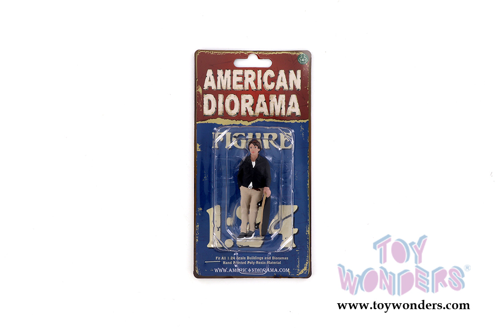 38342 American Diorama Figurine - Skateboarder Figure III. 1:24 scale male figure in black jacket and beige pants. Hand painted cold-cast resin. This 3"H figure is great for decorating 1:24 scale cars, auto body shop and dioramas. Manufactured by American Diorama. Individually packed in a blister card. Card size: 4" x 7.5". Note: Vehicle is not included.