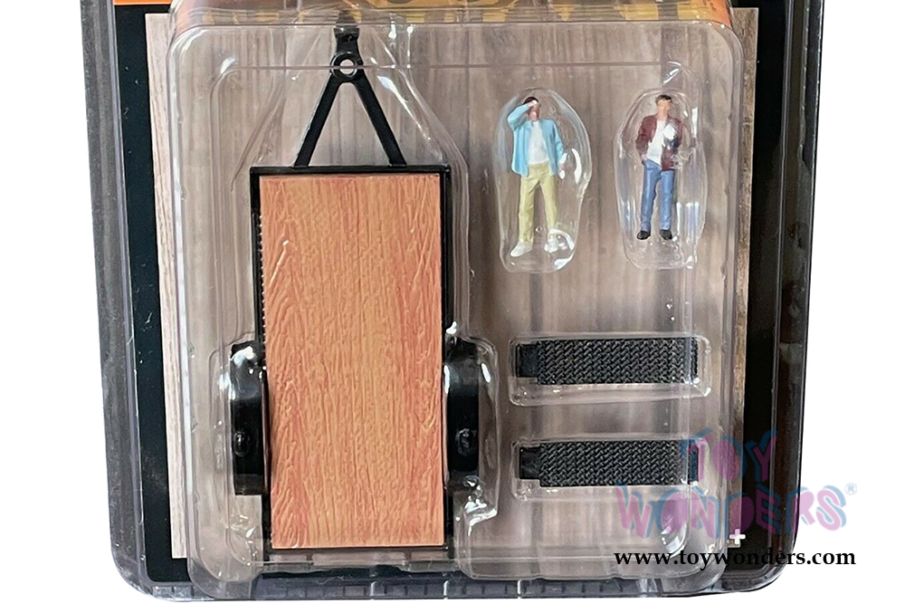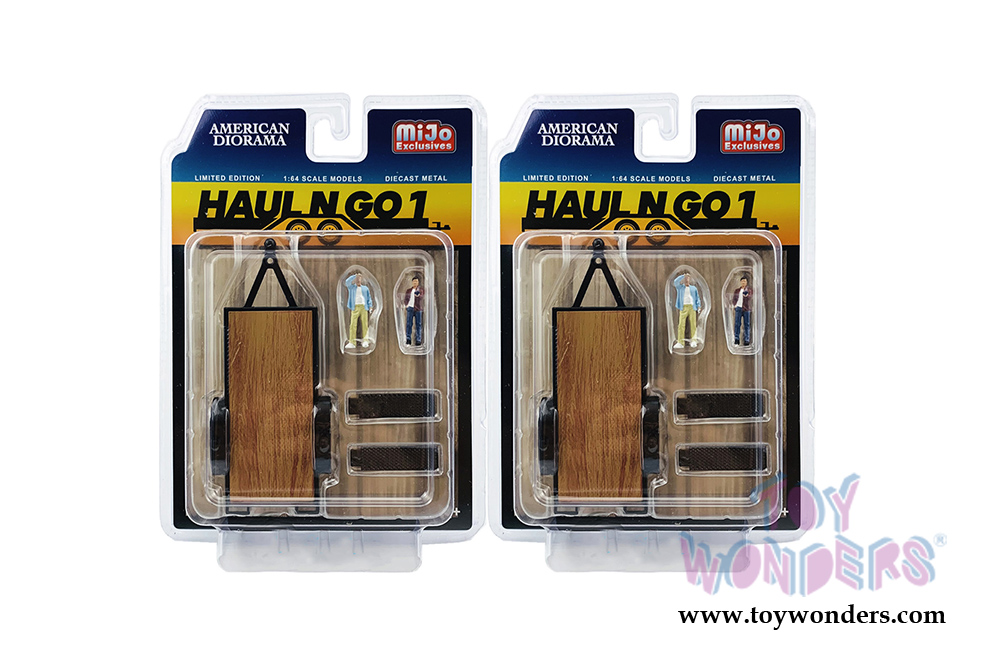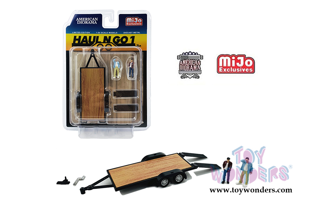 38377MJ American Diorama/Mijo Exclusives - Haul N Go 1 Set. Scaled for 1:64 scale model cars or 1:64 scale dioramas. This exclusive Multipack includes: 2 Figurines and a trailer. Trailer is approximately 4.25" inches long. Each figurine is approximately 1" tall. Limited Edition. Die Cast Metal. Card size: 5.5"W x 7.5"H.  Manufactured by American Diorama for Mijo Exclusives. 12 sets per inner.