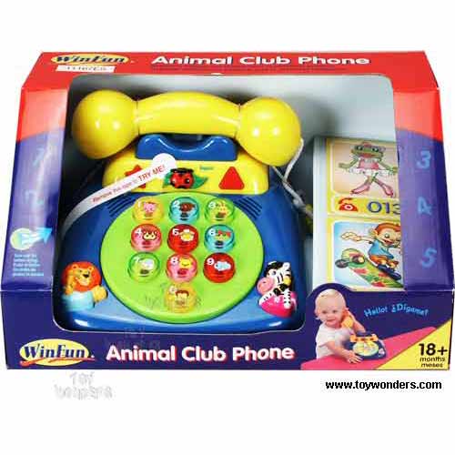 11167ES Battery Operated Animal Club Phone. This telephone features interactive talking with lift-off receiver, 4 bilingual (English/ Spanish) learnign activities (animal/ animal sound effect recognition, number identification, dial-an-animal for fun sentences and quick pick game), 12 different animals, 10 light up bottons, and animal phone cards included. For ages 18 months and up. Requires 3 "AA" batteries (included). Box size: 12.5"Lx 8.5"Wx 6.5"H. 6 pcs per inner box.