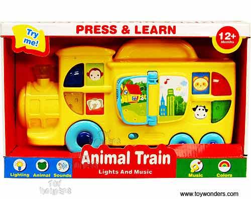 5016 Animal Locomotive Train w/ Lights & Sounds. 12.25" interactive book features flippable page with sound, buttons with flashing lights & animal sounds (monkey, elephant, panda & cow), and adjustable volume. Includes 2 "AA" batteries. Box size: 13.5"L x 8.5"W x 3"H. 12 pcs per inner box. For 12 months and up.