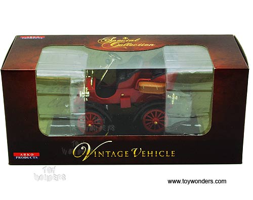 00301R Arko - 1903 Ford Model A. 1:32 scale diecast collectible model car. This Ford Model A is a 3.75"Lx 2.5"Wx 2.25"H die-cast metal car. Sits on a display plaque. This 1903 Ford Model A is manufactured by Arko. 00301 is in RED color. Individually packed in a window box. Box size: 8"Lx 3.5"Wx 3.5"H.