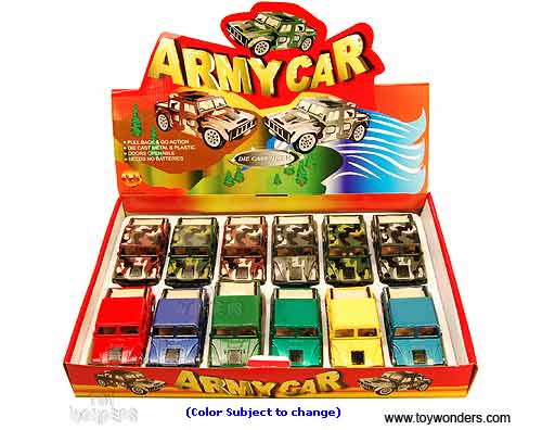 31322D/DH Army Cars. This military car is a 5"L x 2.25"W x 2"H diecast metal vehicle with openable doors and pullback motor action. 12 pcs per display box in assorted styles. 48 pcs per inner. Z8.