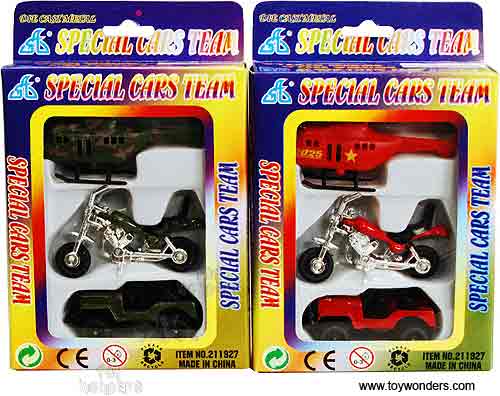 211927 Army & Emergency Vehicle Play Set. 3 pcs vehicle playset includes helicopter, motorcycle and car. Diecast vehicles are in assorted colors. 3 vehicles packed in a blister card. Card size: 4"W x 5.25"H x 1.25"D. 72 sets/ inner.