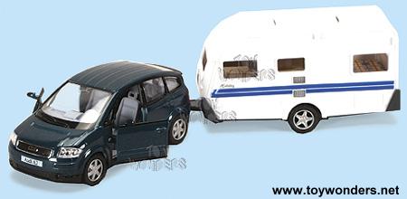 5047CA Audi A2 SUV and Camper. 1:32 scale. Vehicles are 5" long each. SUV is diecast with pullback motor action and opening doors. Camper has opening roof and side and also molded furnishings. Each Audi A2 and Camper is packaged in a Bubble package. Pkg. measures: 11.75"L x 3.5"H x 3"W. Assorted colors. Kinsmart/Kintoy.