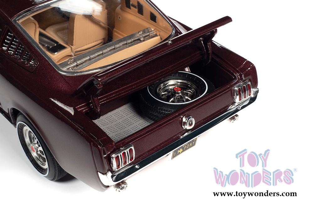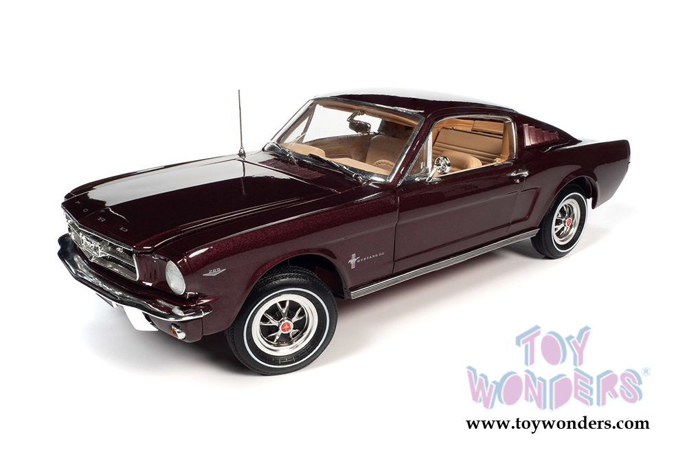AMM1248 Auto World - American Muscle 30th Anniversary | 1965 Ford Mustang 2+2 Hardtop. 1:18 scale diecast collectible model car. This Mustang is a 10.5"L x 4.5"W x 2.75"H diecast metal car with openable hood, doors and trunk. Featuring steerable front wheels, detailed engine, accurate interior, and chassis. This '65 Ford is manufactured by Auto World. Individually packed in a window box. Box size: 13.25"L x 6.25"W x 5"H. AMM1248 is in Vintage Burgundy.