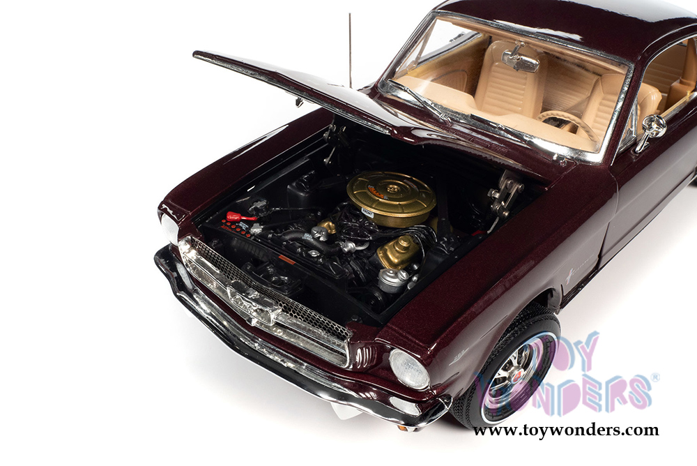 As one of our most highly-detailed 1:18 scale vehicles, Auto World is excited to replicate this 2+2 in factory-matched Vintage Burgundy paint. The Palomino interior complements the exterior with its classic tan and rich browns. We also opted to replicate the popular 289 cu. in. motor and optional reverse lights. This pony was born to run!