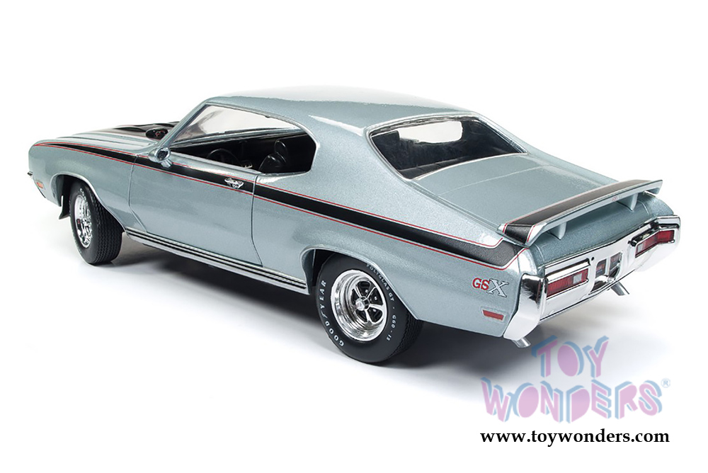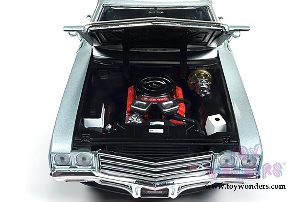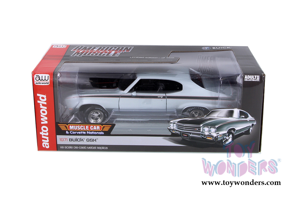 AMM1138 Auto World American Muscle - 1971 Buick® GSX™ Hardtop. 1:18 scale diecast collectible model car. This Buick is an 11"L x 4"W x 3"H diecast metal car with openable hood and doors, steerable front wheels, detailed engine, accurate interior and chassis. This 1971 Buick is manufactured by Auto World. Individually packed in a window box. Box size: 13.25"Lx 6.1"Wx 5"H. AMM1138 is in PLATINUM Mist color. Limited Edition to 1002 pcs.