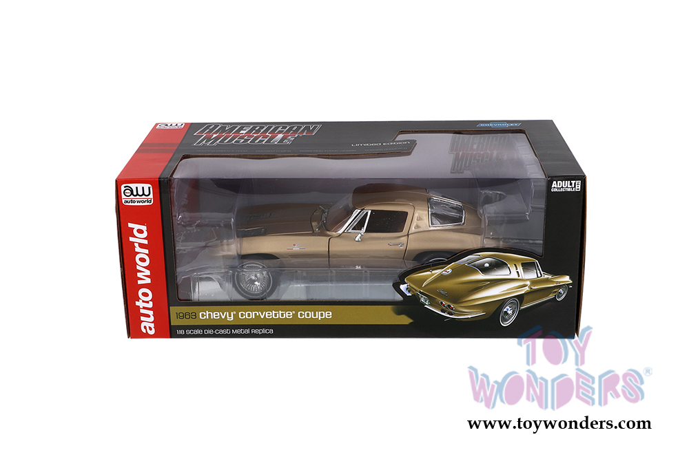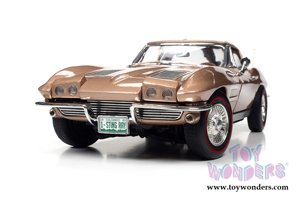 AMM1222 Auto World - American Muscle | 1963 Chevrolet® Corvette® Stingray Coupe. 1:18 scale diecast collectible model car. This Chevy® is a 10"L x 4"W x 3.25"H diecast metal car with steerable front wheels, openable hood and doors. Featuring a detailed engine, accurate interior, chassis and trunk. This '63 Chevy® is manufactured by Auto World. Individually packed in a window box. Box size: 13.25"Lx 6.25"Wx 5"H. AMM1222 is in Saddle Tan Metallic.