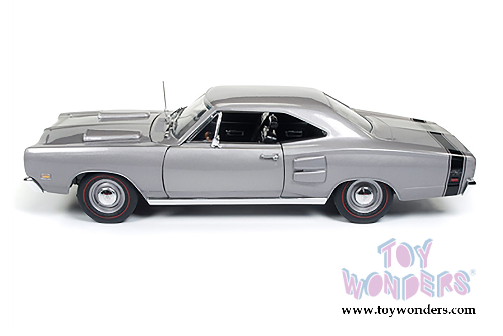 AMM1141 Auto World American Muscle - 1969 Dodge Coronet R/T Hardtop. Muscle Cars and Corvette Nationals. 1:18 scale diecast collectible model car. This '69 Dodge Coronet is an 11"L x 4"W x 3"H diecast metal car with openable hood and doors, steerable front wheels. Manufactured by Auto World. Individually packed in a window box. Box size: 13.25"L x 6.1"W x 5"H. AMM1141 is in SILVER.