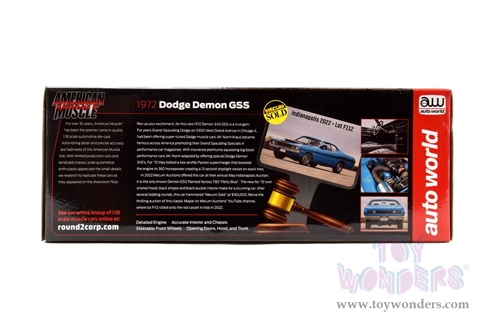 Auto World American Muscle - Dodge Demon GSS "Mecum Auctions" (1972, 1/18 scale diecast model car, Petty Blue/Black stripes) AMM1345 MAP: $104.99