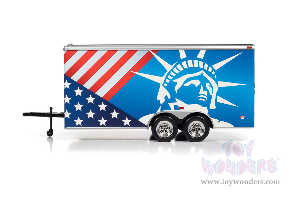 AMM1284 Auto World American Muscle - Four Wheel Enclosed Trailer Patriotic. 1:18 scale diecast collectible model car. This trailer is a 13.5"L x 6"W x 5.25"H diecast metal car. Fits most 1:18 scale die-cast vehicles up to 10 inches long. Stationary trailer jack with hitch. This Four Wheel Trailer is manufactured by Auto World. Individually packed in a window box. Box size: 14.25"L x 6.5"W x 6"H. AMM1284 is in Patriotic colors.