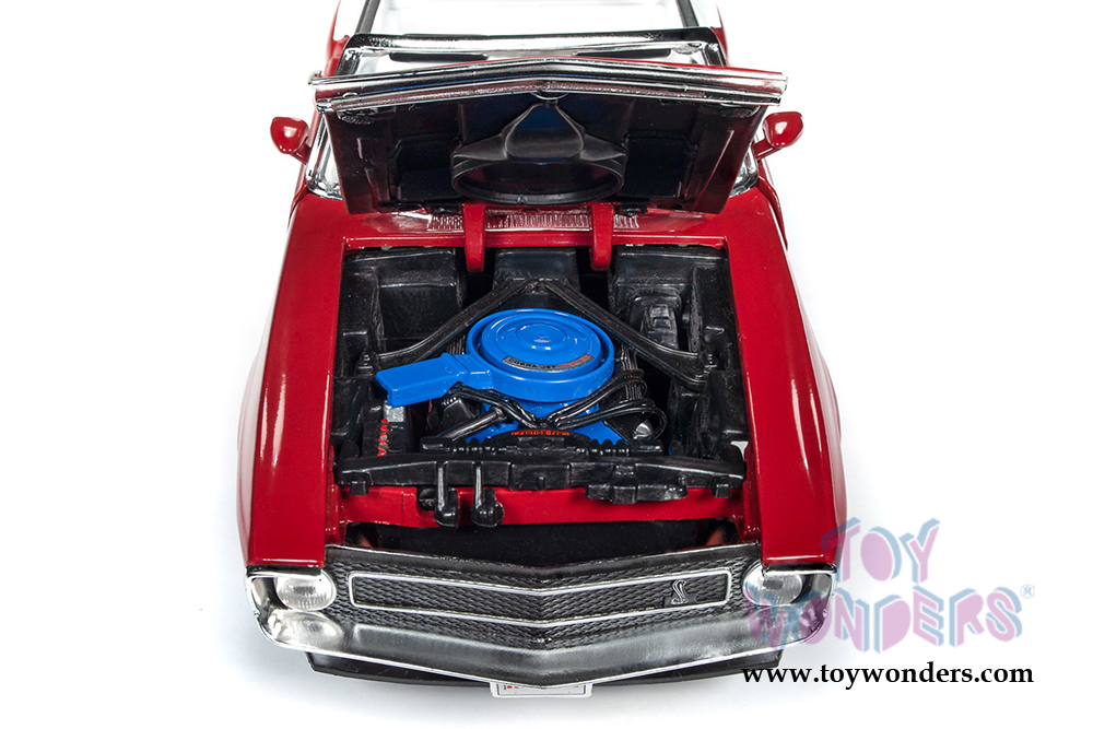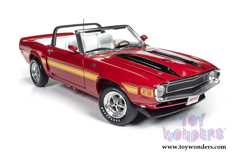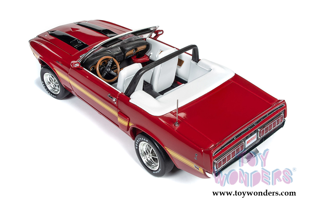AMM1187 Auto World American Muscle - Hemmings Muscle Machines | 1970 Shelby GT500® Convertible. 1:18 scale diecast collectible model car. This Shelby is a 10.5"L x 4"W x 3"H diecast metal car with steerable front wheels, openable hood, and doors. Featuring a detailed engine, accurate interior, and chassis. This 1970 Shelby® is manufactured by Auto World. Individually packed in a window box. Box size: 13.25"L x 6.1"W x 5"H. AMM1187 is in Apple RED color with black and yellow stripes.
