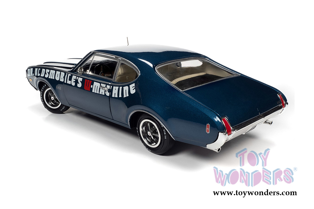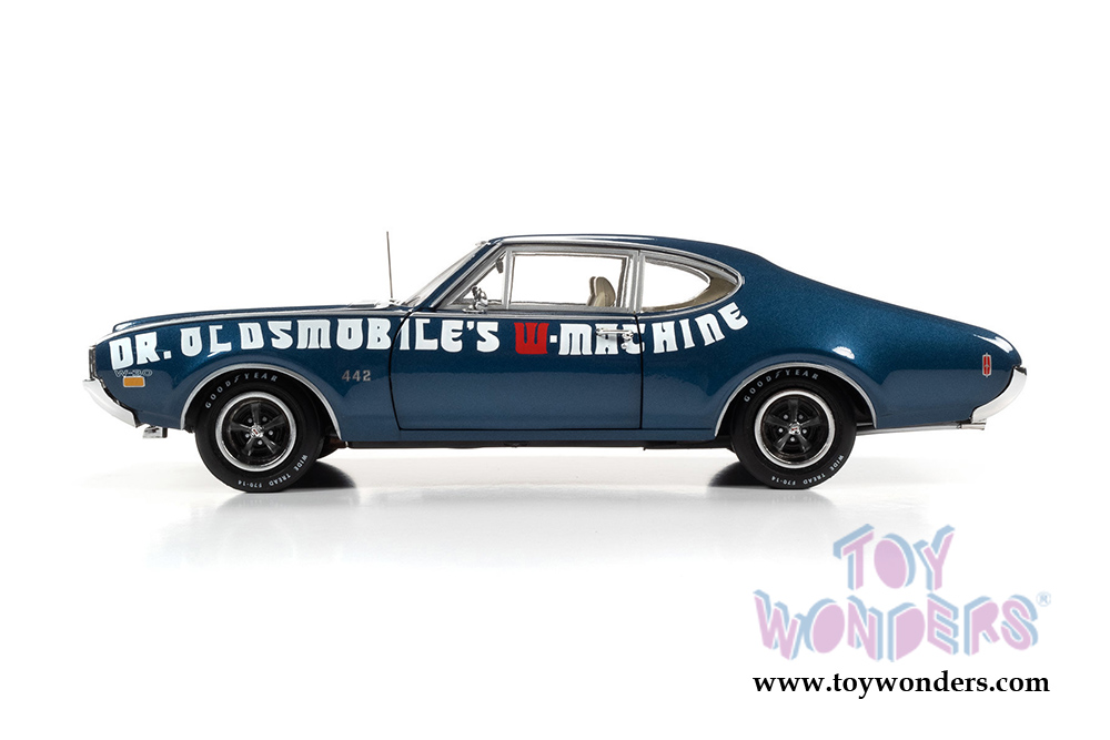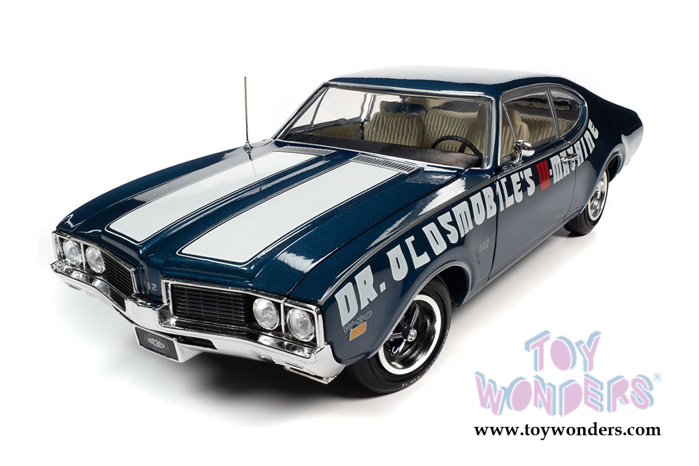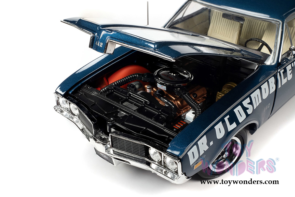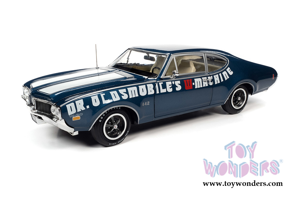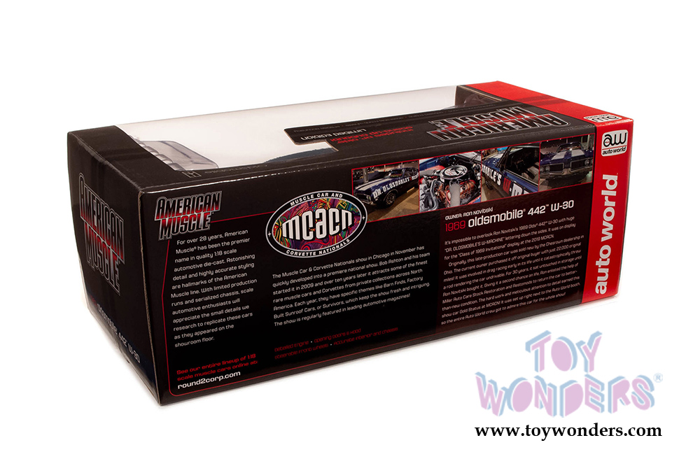 Auto World American Muscle - Oldsmobile® 442 W-30 Coupe Muscle Car & Corvette Nationals (MCACN) (1969, 1/18 scale diecast model car, Trophy Blue/White) AMM1235