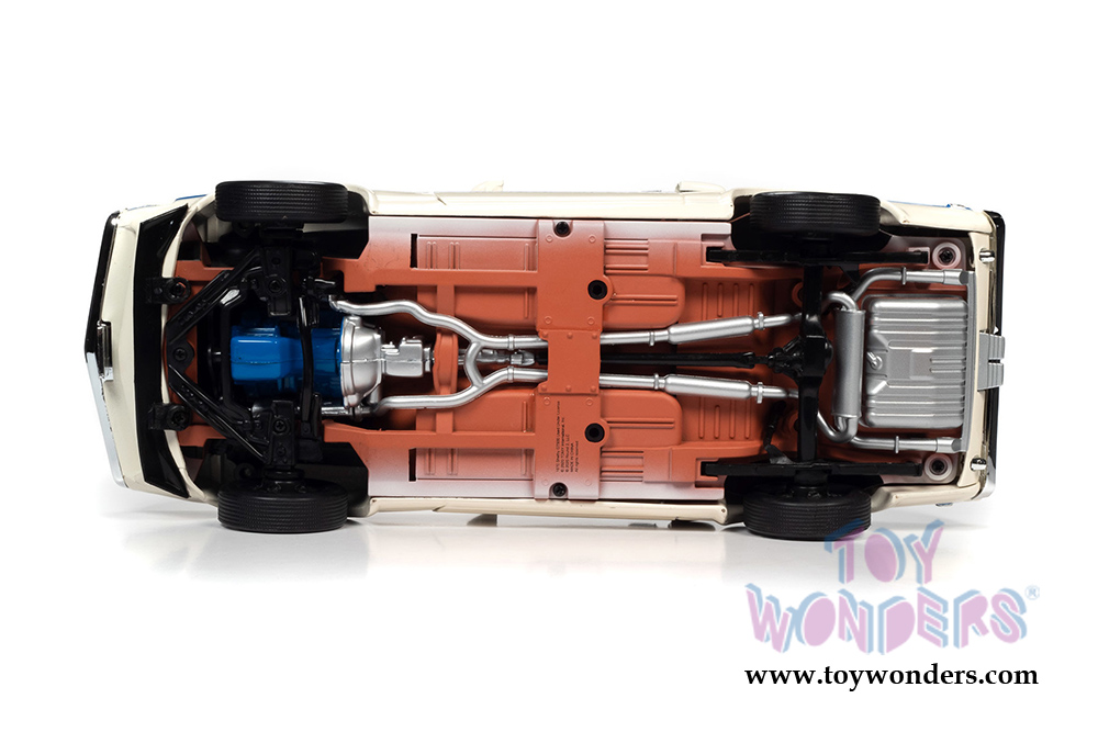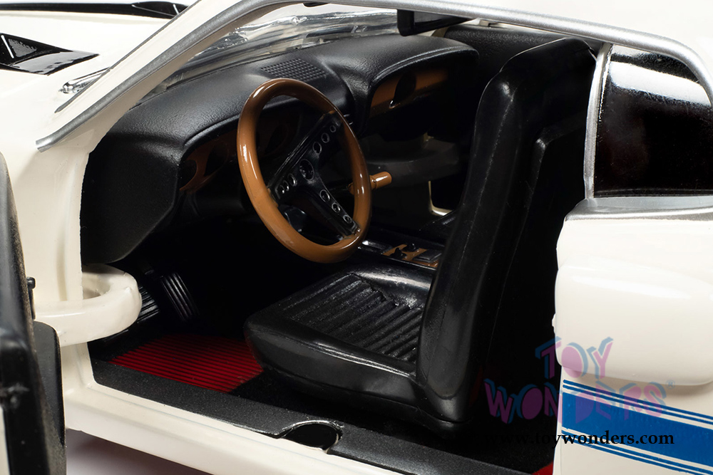On the surface, the 1969 and 1970 models received a completely revised front end, plus a new hood with five fully-functional air vents. Under the hood was a powerful Cobra Jet Ram Air 428ci 7.0L V8 producing 405hp and 470 ft.-lbs. of torque. In 1:18 scale, Auto World has accurately replicated this 1970 Shelby GT-500® in bright Wimbledon White, blue GT-500® stripes and proper 5-spoke wheels.
