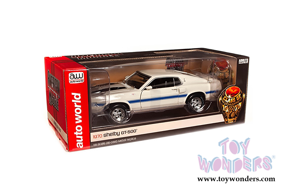 AMM1229 Auto World - American Muscle | 1970 Shelby GT-500® Class of '70 50th Anniversary. 1:18 scale diecast collectible model car. This Dodge is a 10.5"L x 4"W x 2.75"H diecast metal car with steerable front wheels, openable hood and doors. Featuring a detailed engine, accurate interior, and chassis. This '70 Shelby is manufactured by Auto World. Individually packed in a window box. Box size: 13.25"L x 6.25"W x 5"H. AMM1229 is in Wimbledon White with blue and black stripes.