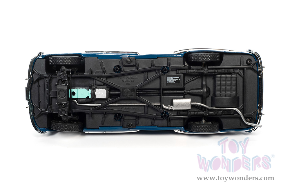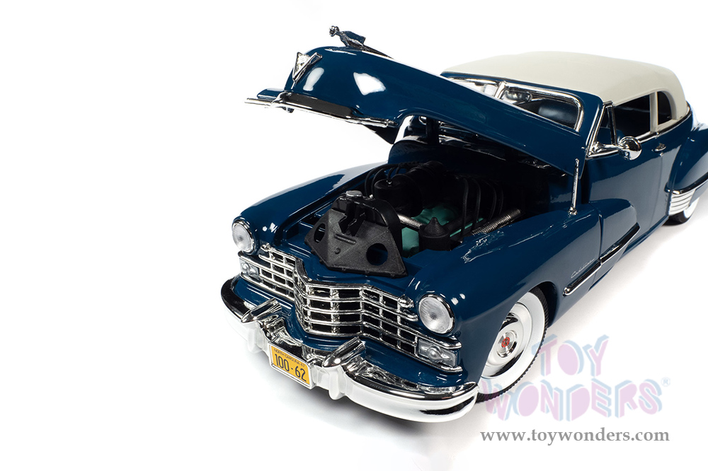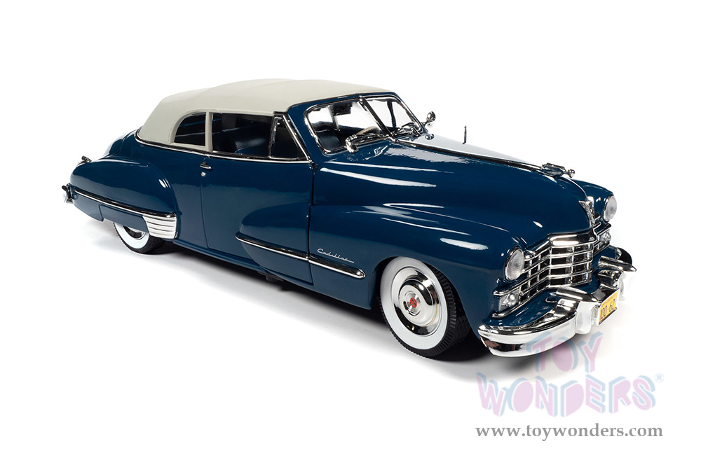 AW274 Auto World - 1947 Cadillac® Series 62 Soft Top. 1:18 scale diecast collectible model car. This Cadillac® is an 11.75"L x 4.25"W x 3.25"H diecast metal car with steerable front wheels, openable hood, doors and trunk. Featuring a detailed engine, accurate interior and chassis. This '47 Cadillac® is manufactured by Auto World. Individually packed in a window box. Box size: 13.25"Lx 6.25"Wx 5"H. AW274 is in Beldon Blue. Limited edition.