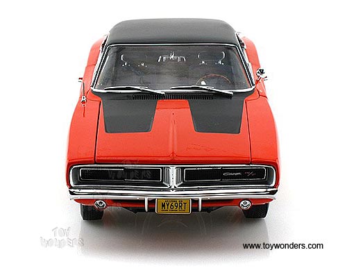 AMM1026 Auto World ERTL American Muscle - 1969 Dodge Charger R/T Hard Top. 1:18 scale diecast collectible model car. This Dodge Charger R/T is an 11.5"L x 4"W x 3"H die-cast metal car with openable hood, doors and trunk, steerable front wheels, and detailed engine, accurate interior and chassis. This 69 Dodge Charger R/T is manufactured by Auto World. Individually packed in a window box. Box size: 13"Lx 6.1"Wx 5"H. AMM1026 is in HEMI ORANGE color with black roof and black stripes on hood.