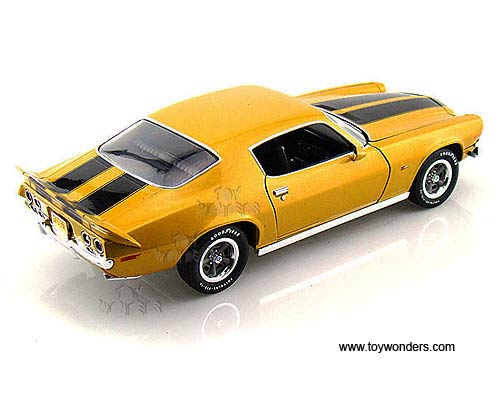 AMM968 Auto World ERTL Elite - 1971 Chevrolet Camaro Z/28 Hard Top 20th Anniversary. 1:18 scale diecast collectible model car. This Chevy Camaro Z28 is a 10.5"L x 4"W x 2.75"H die-cast metal car with openable hood & doors, steerable front wheels, and detailed engine, accurate interior & chassis. This 1971 Chevrolet Camaro Z/28 is manufactured by Auto World. Individually packed in a window box. Box size: 13.25"L x 6.1"W x 5"H. AMM968 is in PLACER GOLD color with Black stripes. GM is a trademark of the General Motors Corporations.