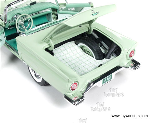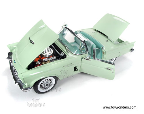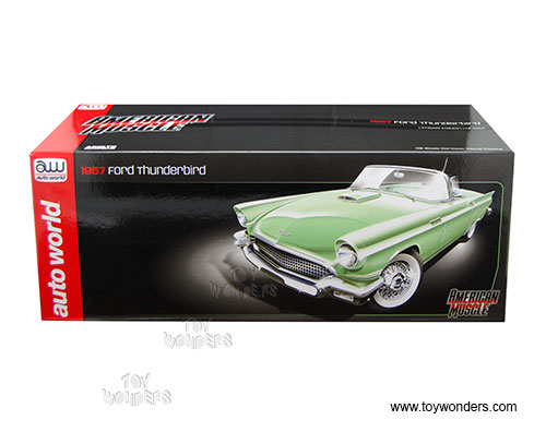 AMM1045 Auto World ERTL American Muscle - 1957 Ford Thunderbird Convertible. 1:18 scale diecast collectible model car. This is a 10.5"L x 4"W x 3"H die-cast metal car with openable hood, doors and trunk, steerable front wheels, and detailed engine, accurate interior and chassis. This 57 Ford Thunderbird is manufactured by Auto World. Individually packed, box size: 13.25"Lx 6.1"Wx 5"H. AMM1045 is in GREEN color.